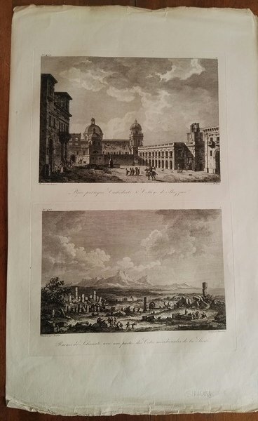 Veduta pubblicata nel “Voyage Pittoresque a Naples et en Sicile". Incisione in rame, ottimo stato di conservazione. Sicile. Dimensioni: 50 cm (lunghezza) x 33,5 (larghezza) cm. Dessinée par Chatelet.
