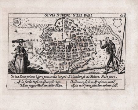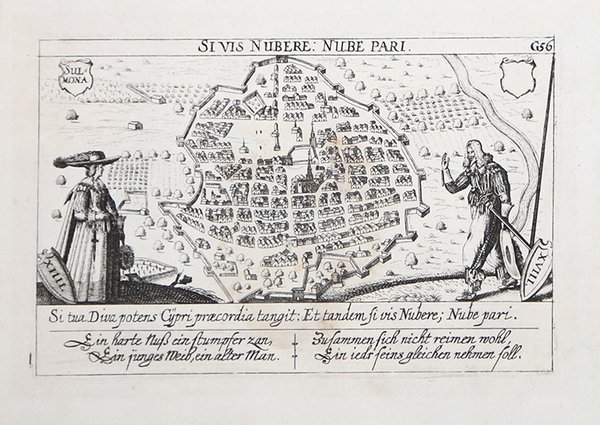 Veduta tratta dall'edizione del 1678 della celebre ' Sciagraphia Cosmica ' nota anche con il titolo ' Das ist Newes Emblematisches Buechlei, dainen in acht Centurijs die vornembste Stat, Vestung, Schlosser der ganzen Welt. ' stampata a Norinberga. La ' Sciagraphia Cosmica, venne ampliata sotto la supervisione di Kieser dopo la morte di Meisner nel 1625, arrivando quindi ad una composizione di 800 magnifiche incisioni. ' Ogni opera è caratterizzata da un motto sopra l'immagine, e da versi emblematici (in latino o tedesco). L'opera è la combinazione di due generi allora popolari, il libro degli stemmi e il "Teatro delle città". Tra i maestri incisori e miniatori che contribuirono a questa serie ci sono Matthäus Merian, Sebastian Furck, Christian Stimmer e forse anche Meisner stesso, che concepì l'opera e contribuì a buona parte della prosa. ' Incisione in rame, con margini, in perfetto stato di conservazione. View taken from the 1678 edition of the famous ' Sciagraphia Cosmica ' also known with the full title ' Sciagraphia Cosmica: ' Das ist Newes Emblematisches Buechlei, dainen in acht Centurijs die vornembste Stat, Vestung, Schlosser der ganzen Welt. printed in Nuremberg. The ' Sciagraphia Cosmica, was expanded under the supervision of Kieser after the death of Meisner in 1625, thus arriving at a composition of 800 magnificent engravings. ' Each engraving is characterized by a motto above the image, and by emblematic verses (in Latin or German). The work is a combination of two then-popular genres, the book of coats of arms and the "Town Book". Among the master engravers and illuminators who contributed to this series are Matthäus Merian, Sebastian Furck, Christian Stimmer, and perhaps Meisner himself, who conceived the work and contributed much of the prose. ' Copperplate engraving, with margins, in perfect condition. Cfr. Cremonini pagg. 57/58, 45a.