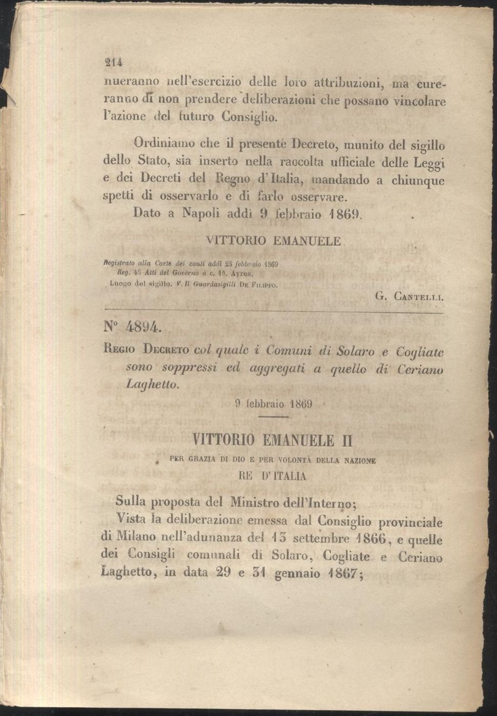 regio decreto col quale i comuni di Solaro e Cogliate sono soppressi