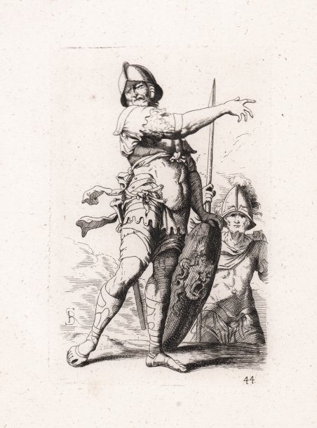 Acquaforte, circa 1675/80, priva di firma. Copia in controparte della stampa di Salvator Rosa, della serie dei capricci con soldati, detta le ' Figurine. ' La serie delle cosiddette ' Figurine ' di Salvator Rosa ebbe un grande successo, documentato dal gran numero di imitazioni che ebbe in tutta Europa. La prima edizione di questa raccolta fu realizzata dal Rosa in 62 tavole all’acquaforte incise tra il 1656 e il 1657. Almeno otto diverse copie della stessa edizione furono eseguite tra la fine del XVII e la prima metà del XVIII secolo. ' ' La serie venne inserita nella celebre ' Academia Todesca della Architectura, Scultura & Pittura: oder Teutsche Academie der Edlen Bau, Bild-und Mahlerey-Künste, raccolta monumentale, riccamente illustrata da centinaia di incisioni raffiguranti antichità, architettura e mitologia classica, edita a Norimberga e Francoforte tra il 1675 ed il 1680. ' Per le incisioni, il Sandrart si avvalse dei suoi collaboratori Karl Gustav von Amling (1650-1703); Philip Kilian (1628-1693); Richard Collin (1627-97); Georg Andreas Wolfgang (1631-1716); Johann Georg Waldreich (d.1680); Melchior Küsel (1626-1683); Franck, Johann (fl.1659-1690); George Christoph Eimmart (1638-1705); Susanna Maria von Sandrart (1658-1716); Bartholomäus Kilian (1630-1696). Bellissima prova, impressa su carta vergata coeva, con margini, in perfetto stato di conservazione. ' Bibliografia Cfr. Bartsch, Le ' Peintre graveur ' (XX.283.51); Wallace p. 330, 133; National Gallery (Washington), ' Mark J. Millard, III (1998), no. 111; F.W. H. Hollstein, ' German engravings . ca. 1400-1700 ' (1954-), 38-41; Anna Schreurs, ' Unter Minerva schutz: bildung durch kunst in Joachim von Sandrarts 'Teutscher Academie' ' (2012). Etching, ca. 1675/80, unsigned. Copy of Salvator Rosa's print from the Capricci with soldiers series, called the ' Figurine. The series of the so-called ' Figurine ' of Salvator Rosa had a great success, documented by the large number of imitations that had throughout Europe. The first edition of this collection was made by Rosa in 62 etching plates engraved between 1656 and 1657. At least eight different copies of the same edition were made between the end of the 17th and the first half of the 18th century. This set is part of the monumental ' Academia Todesca della Architectura, Scultura & Pittura: oder Teutsche Academie der Edlen Bau, Bild-und Mahlerey-Künste ' (Deutsche Academy of Architecture - Sculpture – Painting). ' The first edition, in German, was published by Joachim von Sandrart in Nuremberg, in three volumes respectively in 1675, 1679 and 1680. For the plates Sandrart used his students as and many others artist as ' Karl Gustav von Amling (1650-1703); Philip Kilian (1628-1693); Richard Collin (1627-97); Georg Andreas Wolfgang (1631-1716); Johann Georg Waldreich (d.1680); Melchior Küsel (1626-1683); Franck, Johann (fl.1659-1690); George Christoph Eimmart (1638-1705); Susanna Maria von Sandrart (1658-1716); Bartholomäus Kilian (1630-1696). The work is full of illustrations of ancient and modern Roman buildings, sculpture, the theory of painting, biographies of artists, including German and contemporary (ie seventeenth-century) artists, and antiquities. Joachim von Sandrart was a painter of some note but it is for his ' Teutsche Academie ' that he is chiefly remembered. His compendious treatise includes sections on ancient sculpture and architecture, perspective, the theory of painting, artists’ biographies, a translation of Ovid’s Metamorphoses and so on. The second part of Book I purports to give a history of art from its earliest origins, and opens with an engraving of two scenes of legendary accounts of the discovery of drawing. ' The work is dedicated to the world-renowned German nation and to champions and lovers of art ('Der Welt-berühmten Teutschen Nation . Kunst-Helden und Kunstliebenden'). Beautiful proof, printed on contemporary laid paper, with margins, in perfect condition. Bibliografia Cfr. Bartsch, Le ' Peintre graveur ' (XX.283.51); Wallace p. 330, 133; National Gallery (Washington), ' Mark J. Millard, III (1998), no. 111; F.W. H. Hollstein, ' German engravings . ca. 1400-1700 ' (1954-), 38-41; Anna Schreurs, ' Unter Minerva schutz: bildung durch kunst in Joachim von Sandrarts 'Teutscher Academie' ' (2012). Cfr.