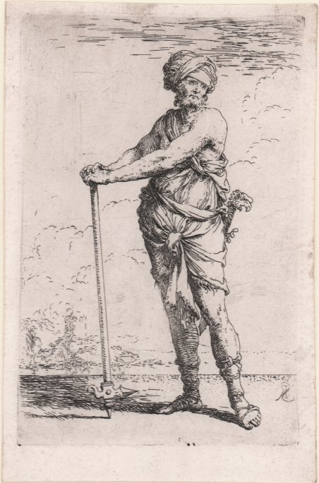 Acquaforte e puntasecca, 1656/8 circa, monogrammata in lastra. Della serie conosciuta come ' Diverse Figure. Bellissima prova, ricche di toni, impressa su carta vergata coeva, con sottili margini, in eccellente stato di conservazione. Esemplare in secondo stato, tutte con il monogramma; le prove di primo stato, ove esistano, sono senza monogramma e note in un solo esemplare. Conosciuta con il nome di ' Diverse Figure ' o ' Figurine, rappresentano senza dubbio l’opera grafica più famosa di Salvator Rosa. Già in epoca era considerata un modello per i giovani artisti, e venne più volte copiata sia in Italia che all’estero. Nelle figure dei soldati in costumi esotici oppure d’invenzione il Rosa svolge un tema trattato da molti incisori quali Callot, Della Bella e Filippo Liagno, con il quale aveva un rapporto stretto, e tramite il quale probabilmente arrivò a conoscere i soggetti dei lanzichenecchi del XV secolo di Dürer e Urs Graf. ' Una lettera dell’artista all’amico Ricciardi datata 1656 permette di datare la serie con sicurezza la periodo 1656/8. Bartsch elenca l’opera composta da 61 stampe, mentre Rotili e Wallace descrivano alcune rare variante dei soggetti, poi mai inserite nella serie, portando il numero delle Figurine a 72. Etching and drypoint, circa 1656/8, monogrammed in plate. From the series known as ' Diverse Figure. Beautiful proof, rich in tone, impressed on contemporary laid paper, with thin margins, in excellent condition. Example of the second state, sjowing the Rosa’s monogram; first-state proofs, where they exist, are unmonogrammed and known in only one copy. Known as ' Diverse Figure ' or ' Figurine, they are without doubt the most famous graphic work of Salvator Rosa. Already at that time it was considered a model for young artists, and was copied several times both in Italy and abroad. In the figures of soldiers in exotic or invented costumes, Rosa develops a theme treated by many engravers such as Callot, Della Bella and Filippo Liagno, with whom he had a close relationship, and through whom he probably came to know the subjects of the fifteenth-century Lansquenets by Dürer and Urs Graf. A letter from the artist to his friend Ricciardi dated 1656 allows the series to be dated with certainty to the period 1656/8. Bartsch lists the work as consisting of 61 prints, while Rotili and Wallace describe some rare variants of the subjects, later never included in the series, bringing the number of Figurine to 72. Cfr. Bartsch 42 II/II; Wallace 35 II/II.
