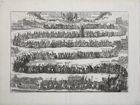 Acquaforte e bulino, 1758, datata in lastra in alto al centro. Magnifica prova, impressa su carta vergata coeva, con margini, in eccellente stato di conservazione. Impressa dalla Calcografia della Reverenda Camera Apostolica, il modello per lastra venne intagliata dallo Specchi nel 1692 ed utilizzata per il possesso di Innocenzo XII. Molto rara. Ex collezione Laetitia Pecci Blunt. Bibliografia Simonetta Tozzi, Incisioni barocche di feste ed avvenimenti, p. 63, I. 28. ' Etching and engraving, 1758, dated on upper centre plate. Magnificent work printed on contemporary laid paper with margins, in excellent condition. This plate was printed by the chalcography of the Reverenda Camera Apostolica; the model for the plate was carved by Specchi in 1692 and used for Innocenzo XII’s installation. Very rare. Ex collezione Laetitia Pecci Blunt. Literature: Simonetta Tozzi, Incisioni barocche di feste ed avvenimenti, p. 63, I. 28. ' Cfr.