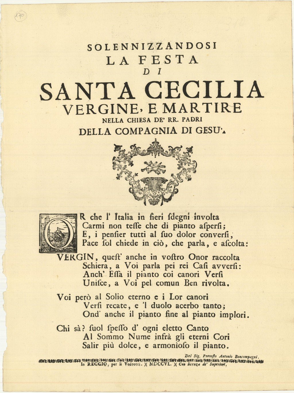 Documento, antico ed originale. proveniente da importante collezione reggiana. Ode a Santa Cecilia – In Reggio, per li Vedrotti. MDCCVL. Con licenza de’ Superiori