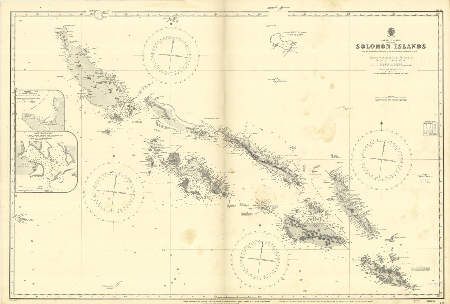 Solomon Islands From All available information in the Hydrographic Department to 1931. In the left side of the chart insert of Gazelle Harbour From the German Government Charts to 1919, Gizo Anchorage by Lieut F.J. Rendell & Nav. Sub. Lieut J.W. Brown 1875. London Published at the Admiralty 7th July 1874, under the Superintendence of Captain F.J. Evans, Hydrographer. Small corrections. Folded editorially. Autore: Admiralty Charts. Luogo: Salomon Islands - Pacific Ocean. Anno: '900. Tecnica: incisione. Dimensioni: 660x990 mm