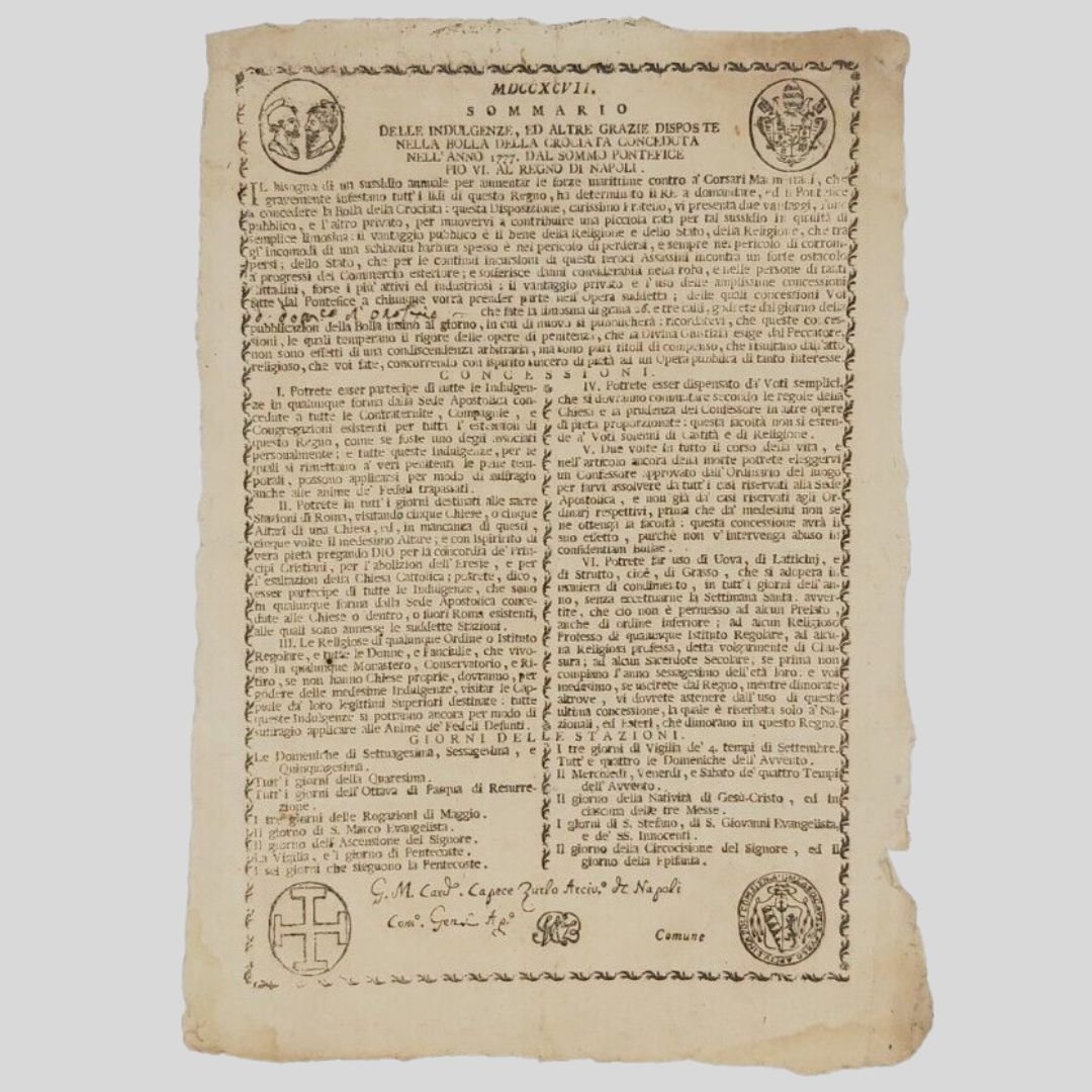 Sommario delle Indulgenze e delle altre grazie disposte nella Bolla della Crociata conceduta nell’anno 1777, dal Sommo Pontefice Pio VI al Regno di Napoli.