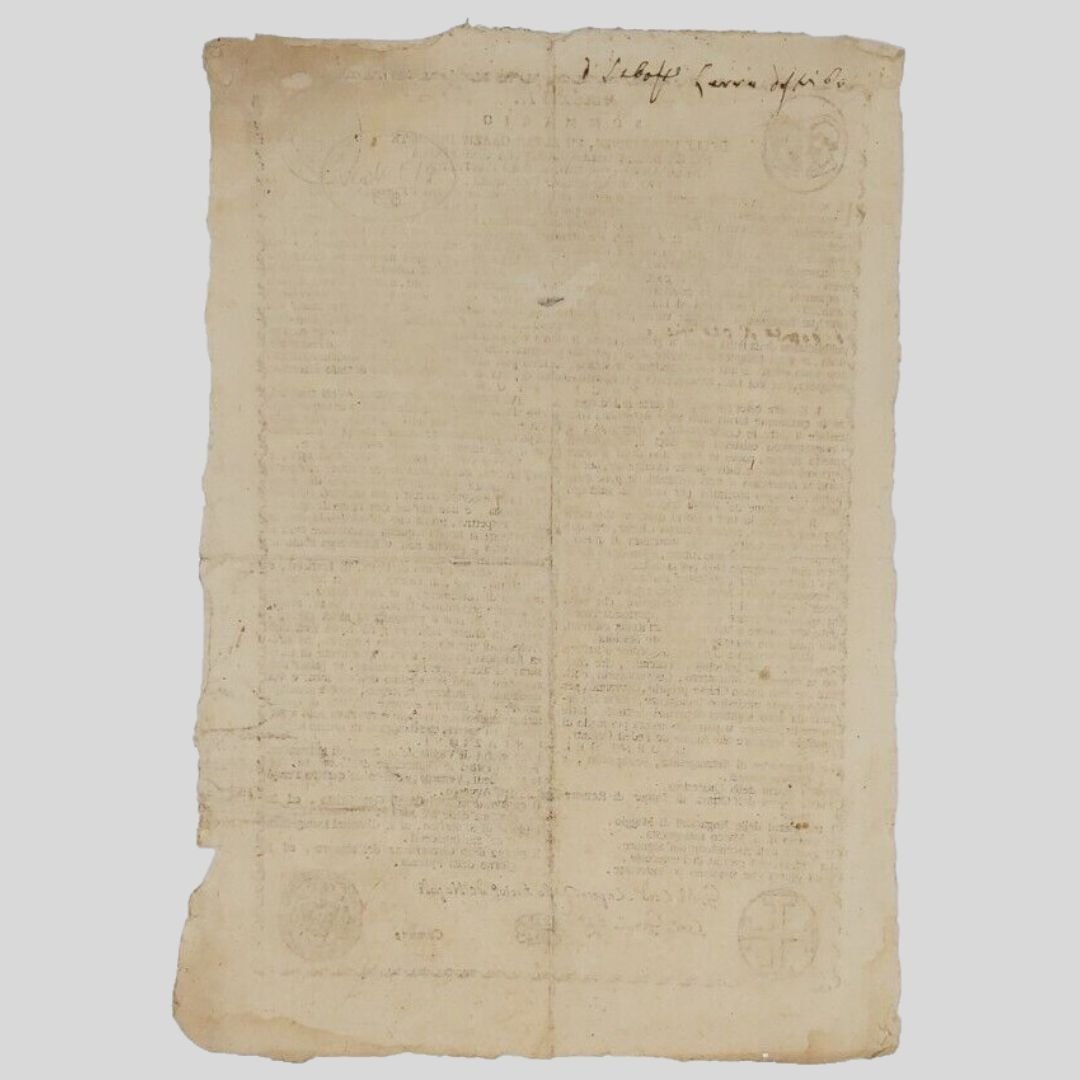 Editto originale, cm 20,5×30,7. Agli angoli sigilli e simboli ecclesiali incisi. Sottoscritto da Giuseppe Maria Capece Zurlo Arcivescovo di Napoli. Tracce d’uso, fioriture e insignificanti mancanze ai margini bianchi. Interessanti le sei concessioni extra penitenziali, tra cui l’ultima che autorizza l’uso di uova, latticini, strutto in tutti i giorni dell’anno senza eccettuarne la Settimana Santa. Ciò non è permesso ad alcun religioso e religiosa se prima non compiano il sessantesimo anno di età. È permesso unicamente ai residenti nel regno. Non comune.