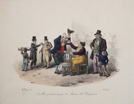 Scena di costume tratta dalla celebre raccolta Nuova raccolta di Costumi e Vestiture di Napoli e suoi d'intorni, disegnata da Gaetano Dura e stampata da Federico Gatti [Litogr. Gatti e Dura (1833-1840)]. La vivace raccolta, edita dalla famosa litografia napoletana, ci presenta una completa suite di venditori, personaggi tipici e costumi della Napoli ottocentesca e dei suoi dintorni, tutti rappresentati nelle loro abitudini e costumi caratteristici. Litografia, bella coloritura coeva, in ottimo stato di conservazione. Costume scene from Nuova raccolta di Costumi e Vestiture di Napoli e suoi d'intorni drawn by Gaetano Dura and printed by Federico Gatti [Litogr. Gatti e Dura (1833-1840)]. ' This collection, published by the famous Neapolitan lithographer, presents us with a complete suite of sellers, typical characters and customs of 19th century Naples and its surroundings, all represented in their characteristic costumes. ' Lithograph, beautiful original colouring, in excellent condition. Cfr.