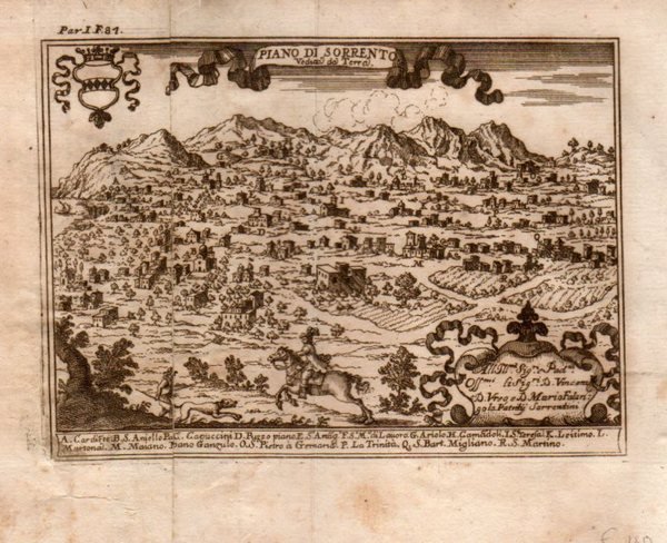 SORRENTO - "Piano di Sorrento". Bella veduta della piana, molto animata e con cavaliere in primo piano. Elenco dei luoghi notabili A-S.