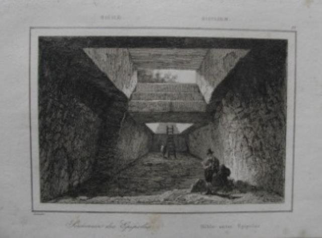 Seconda meta' dell' '800. Dalla "Italie Pittoresque", incisione su rame, b/n, cm 13,5 x 20,5 (il foglio). Piccola veduta di Siracusa con i Sotterranei di Epipole.
