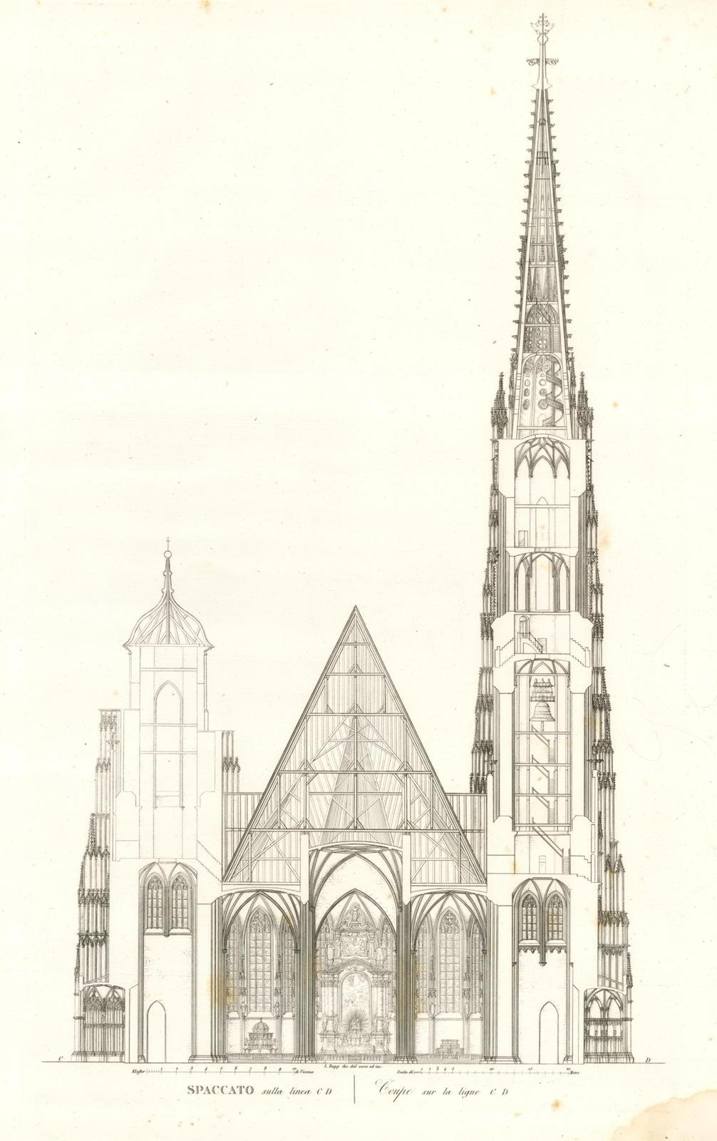 Incisione, antica ed originale, con la raffigurazione di uno spaccato del tempio, il titolo si ripete in francese. Inserita nell'opera "Chiese Principali d'Europa Dedicate a Sua Santità Leone XII Pont. Mas." edita in Milano presso gli editori Contr. dé Bossi e Presso Ferd. Artaria ed a Roma presso i Fratelli De Romanis. Leggerissimo foxing e nell'angolo basso di destra gora