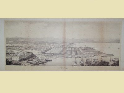 Litografia in seppia di mm 235x540 raffigurante la zona del porto e delle industrie; sullo sfondo sono visibili le montagne. Buon esemplare con lievi e leggere fioriture; minimo ingiallimento lungo la piega centrale.<BR>