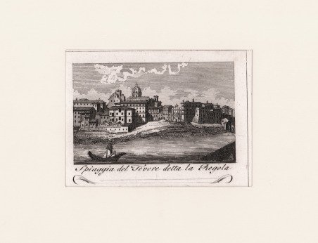 Veduta tratta dalla celebre Raccolta di num. 320 Vedute sì antiche, che moderne della città di Roma. …Incise a bulino in N. 80 rami, In Roma Nella Calcografia di Agapito Franzetti a Torsanguigna Col Permesso. ' L’opera si compone di un frontespizio calcografico e di 80 tavole numerate, ognuna composta da quattro vedute. Viene stampata senza data; molti repertori la datano intorno al 1790 circa, forse perché stampata su carta vergata. Una datazione intorno al 1800 ci sembra tuttavia più plausibile. ' Agapito Franzetti, calcografo attivo a Roma con bottega tra via del Corso e Torsanguigna, è noto per le sue piccole incisioni di veduta che servivano spesso come biglietti da visita. Tutte contengono, infatti, una linea in basso, dove si poteva apporre il proprio nome ad inchiostro. Come indicato nel titolo, le vedute raffigurano sia monumenti e antiche rovine che vedute “moderne”, con piazze, chiese e ville. Ciascuna tavola reca, in basso al centro, il nome dell’incisore. Gli artisti coinvolti sono sei: Jean-Jerome Baugean; Antonio Giuseppe Barbazza; Giovanni Battista Cipriani; Francesco Morelli; Antonio Poretta e Domenico Pronti. Molte delle vedute derivano dalla celebre opera di Giuseppe Vasi, Delle magnificenze di Roma antica e moderna. Pubblicata in 10 volumi dal 1747 al 1761, l’opera presenta 238 incisioni in rame, ciascuna incisione con testo narrativo che fornisce informazioni storiche e documentarie. ' Acquaforte, in buono stato di conservazione. ' Bibliografia: A. Bertarelli, H. Prior, Il biglietto da visita italiano. Cintributo alla storia del costume e dell'incisione nel secolo XVII, Bergamo 1911, p. 162. View of the city printed in Rome by the publisher Agapito Franzetti. Taken from Raccolta di num. 320 Vedute sì antiche, che moderne della città di Roma. …Incise a bulino in N. 80 rami, In Roma Nella Calcografia di Agapito Franzetti a Torsanguigna Col Permesso. ' The work consists of an intaglio frontispiece and 80 numbered plates, each consisting of four views. It is printed without date; many repertories date it around 1790, perhaps because it was printed on laid paper. A date around 1800 seems more plausible. Franzetti, a chalcographer working in Rome with a workshop between Via del Corso and Torsanguigna, is known for his small engravings of views that were often used as business cards. They all contain a line at the bottom where one's name could be written in ink. The small views were often printed four to a sheet. As indicated in the title, the views depict both monuments and ancient ruins and "modern" views, with squares, churches and villas. Each table bears, at the bottom center, the name of the engraver. There are six artists involved: Jean-Jerome Baugean; Antonio Giuseppe Barbazza; Giovanni Battista Cipriani; Francesco Morelli; Antonio Poretta and Domenico Pronti. ' The views are made after Giuseppe Vasi’s monumental work Delle magnificenze di Roma antica e moderna. Published in 10 volumes from 1747 to 1761, the work features 238 copper engravings, each engraving with a narrative text that provides historical and documentary information. ' Bibliografia: A. Bertarelli, H. Prior, Il biglietto da visita italiano. Contributo alla storia del costume e dell'incisione nel secolo XVII, Bergamo 1911, p. 162. Cfr.
