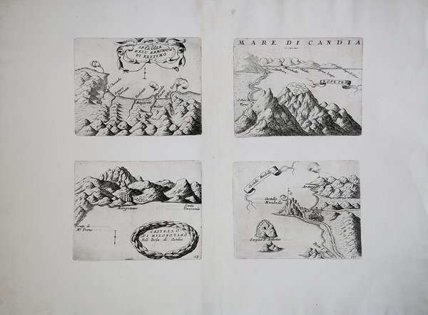 FIRTS ISSUE This example of the map is taken from the very rare Coronelli's ' Citta, Fortezze e, Isole, e Porti principali dell'Europa in Pianta et in Elevatione, Descritte, e Publicate Ad uso dell'Accademia Cosmografica degli Argonauti dal Padre Maestro Coronelli Lettore, e Cosmografo della Serenissima Republica di Venezia, printed in Venice by Domenico Padovani in 1689. Coronelli lived a period of extraordinary editorial fecundity starting from 1689, when he had the chair of geography at the University at the Procuratie, with the publication, in 1690, of the first volume of the ' Atlante Veneto. Under the name of ' Atlante Veneto ' goes the entire collection of thirteen works composed over the next decade, from the ' Isolario ' to the ' Specchio del mare. Copperplate, with full margins, very good condition. Very rare. ' Quattro incisioni da 170x130mm circa. PRIMA EDIZIONE Esemplare tratto dal rarissimo ' Citta, Fortezze e, Isole, e Porti principali dell'Europa in Pianta et in Elevatione, Descritte, e Publicate Ad uso dell'Accademia Cosmografica degli Argonauti dal Padre Maestro Coronelli Lettore, e Cosmografo della Serenissima Republica di Venezia, edito a Venezia da Domenico Padovani nel 1689. Coronelli visse un periodo di straordinaria fecondità editoriale a partire dal 1689, quando ebbe la cattedra di geografia presso l'Università alle Procuratie, con la pubblicazione, nel 1690, del primo volume dell'Atlante Veneto. In effetti sotto il nome di ' Atlante Veneto ' va tutta la raccolta di tredici opere composte nell'arco del decennio successivo, dall'Isolario ' allo ' Specchio del mare. In realtà solo alcune di tali opere possono definirsi atlante, mentre altre, sono opere di compilazione o semplici raccolte di vedute e fortificazioni come questa rara raccolta. Incisione in rame, magnifica prova, con pieni margini, in perfetto stato di conservazione. ' Four engravings of about 170x130mm. Cfr.