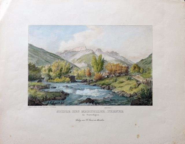 Fr. Sauer, Munchen, fine XIX secolo. Litografia in colore, cm 23 x 29, 5 (il foglio). Piacevole vedutina della Valle Martello e del ghiacciaio Ferner. Buono stato.