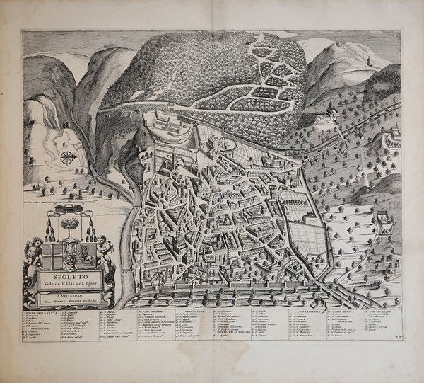 Pianta prospettica di Spoleto di Johannes Blaeu, disegnata secondo il modello di Parenzio-Thomassin. Opera per la prima volta pubblicata nel ' Theatrum Civitatum et admirandorum Italiae, stampato da Johannes Blaeu ad Amsterdam nel 1663. Esemplare tratto dal ' Nouveau Theatre de l'Italie ' pubblicato ad Amsterdam nel 1704/5 da Pierre Mortier e ristampato da R. Alberts nel 1724. Johannes Blaeu, durante la sua lunga attività editoriale pubblica tre volumi sulle città italiane. Nel 1663 i primi tre, suddivisi in Stato della Chiesa, Roma e Regno di Napoli e Sicilia. Alla sua morte i suoi eredi danno alla luce altri due volumi datati 1682 incentrati sulle città del Piemonte e della Savoia, poi ristampati da altri editori nel 1693 e 1697. ' Il francese Pierre Mortier pubblica una ristampa nel 1704/5, intitolata ' Nouveau Theatre de l’Italie. L’opera è in quattro volumi e comprende le lastre del Blaeu, ritoccate e modificate in piccola parte, integrate dall’aggiunta di numerose nuove mappe di proprio disegno, raffiguranti le città della parte settentrionale della penisola, racchiuse nel primo volume dell’opera. L’atlante del Mortier venne pubblicato con testo latino, francese ed olandese. La particolarità che differenzia le due edizioni di Blaeu e Mortier è rappresentata dal fatto che il testo non è al verso della singola mappa (che quindi è bianca nel retro), ma si trova all’inizio di ogni singolo volume. Il grande successo dell’opera diede origine ad un’ulteriore ristampa, praticamente identica, curata da R. Alberts ed edita nel 1724/5. Le opere tratte dalla prima edizione del Blaeu, 1663, sono caratterizzate dalla presenza del testo al verso, qui assente. Incisione in rame, in buono stato di conservazione. Bibliografia Koeman pp. 332/338, Cremonini pp. 83-90. Work first included in ' Theatrum Civitatum et Admirandorum Italiae ad aevi veteris & praesentis temporis faciem expressum à Ioanne Blaeu G. F., ' printed by Johannes Blaeu, Amsterdam, 1663. Example taken from ' Nouveau Theatre de l'Italie ' - Amsterdam nel 1704/5 - by Pierre Mortier or from the da R. Alberts issue (1724). Without descriptive text on the back. The ' Theatrum Civitatum et Admirandorum Italiae ' is the first monumental town book entirely covering Italy, preceded by the "pocket-size" ' Italia Hodierna ' by Jodocus Hondius jr. (1627) and realized in likely competition with Johannes Janssonius who, in 1657, published the ' Theatrum praecipuarum urbium, ' containing a volume dedicated to Italy. Johannes Blaeu, during his long editorial activity published three volumes on Italian cities. In 1663 the first three, divided into the State of the Church, Rome and the Kingdom of Naples and Sicily. At his death his heirs gave birth to two more volumes dated 1682 focused on the cities of Piedmont and Savoy, then reprinted by other publishers in 1693 and 1697. Pierre Mortier publishes a reprint in 1704/5, entitled ' Nouveau Theatre de l'Italie. The work is in four volumes and includes the plates of Blaeu, retouched and modified in small part, supplemented by the addition of several new maps of his own design, depicting the cities of the northern part of the peninsula, enclosed in the first volume of the work. Mortier's atlas was published with Latin, French and Dutch texts. The great success of the work gave rise to a further reprint, virtually identical, edited by R. Alberts and published in 1724/5. Literature Koeman, ' Atlas Neerlandici, pp. 332/338; Cremonini pp. 49-52, 39. Cfr.