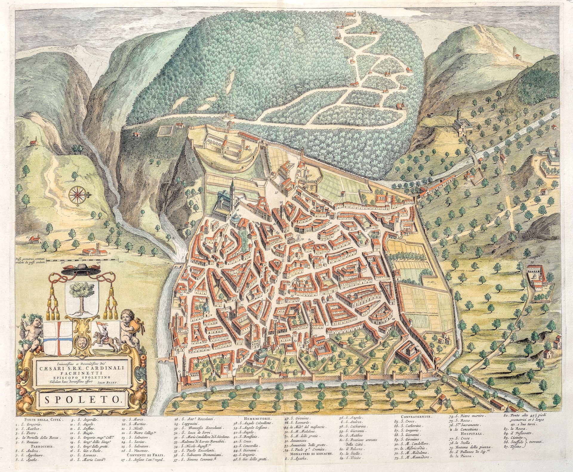 Incisione in rame, colorata a mano, mm 405x560. Bella pianta della città umbra, ritratta con gusto per la miniatura e il dettaglio architettonico. In basso una legenda con 87 rimandi. Al verso del foglio, testo latino relativo alla carta. W. Blaeu, astronomo allievo di Tycho Brahe, fondò un'officina per la costruzione di globi nel 1599; quasi immediatamente iniziò a pubblicare anche carte geografiche, giungendo nel 1630 alla creazione del primo atlante "Atlantis Appendix" e cinque anni dopo, della prima edizione in due tomi del "Atlas Novus". Dopo la sua morte nel 1638, a cura del figlio Johan si giunse nel 1662 alla pubblicazione del celebre "Atlas Maior" in 11 volumi. Nel 1672 un incendio distrusse l'officina e segnò la fine dell'attività. <BR>Buon esemplare con margini leggermente rifilati, ma comunque ampi.<BR><BR>
