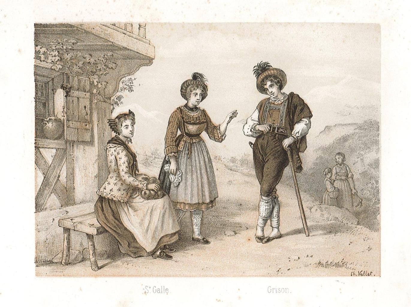 Veduta, antica ed originale, di caratteristici costumi svizzeri di San Gallo e Grigioni stampata a colori e stampata dalla litografia Lemercier di Parigi. Autore: Vallet Ch. Luogo: Costumi svizzeri. Anno: 1840 ca. Tecnica: litografia. Dimensioni: 102x135 mm