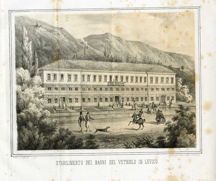 Litografia di cm 22x17 (parte incisa). Condizioni : USATO - Stato : Buono, ordinari segni d'uso e del tempo, qualche fioritura. Altre note : Ripresa dal disegno di Fortunato Depaoli; pubblicata in Girolamo Avancini, Giuseppe Pacher, Le acque ferruginose di Levico nel Trentino dette del vetriolo . Trento, Seiser, 1861.