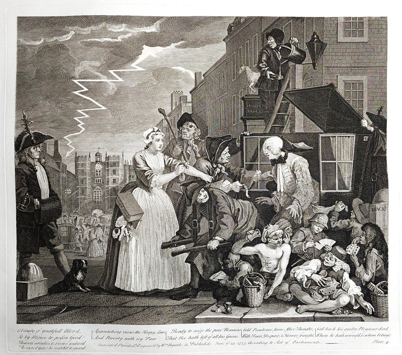Formatosi inizialmente come incisore, Hogarth divenne un illustratore indipendente già nel 1720. Nel tempo libero studiò tecniche pittoriche, in particolare con Sir James Thornhill. Nel 1730 si affermò come ritrattista. Eppure allo stesso tempo Hogarth iniziò a creare serie di immagini aneddotiche che satiravano brillantemente la società e le sue attività. Il primo di questi set, A Harlot's Progress (1732), guadagnò a Hogarth una reputazione nazionale forte e duratura. Nei decenni successivi dipinse e incise singole opere e serie di immagini che costituirono la pietra angolare dell'arte satirica inglese. Grandi maestri come Rowlandson, Gillray, Heath e Cruikshank seguirono le orme di Hogarth.
