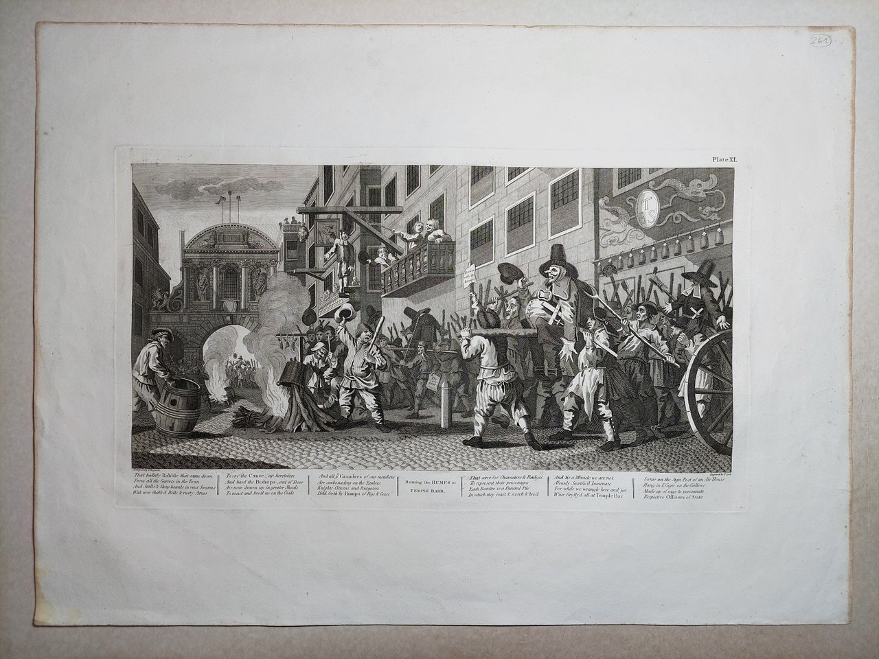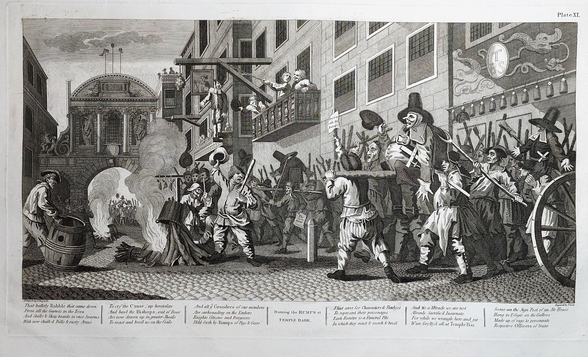 Stampa antica Antique print Original Autore William Hogarth Burning the Rumps at Temple Barr Stampa originale di William Heath da matrici originali di William Hogart 1822