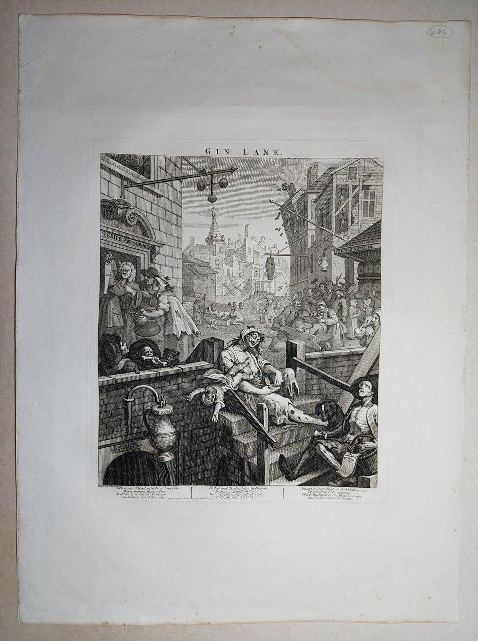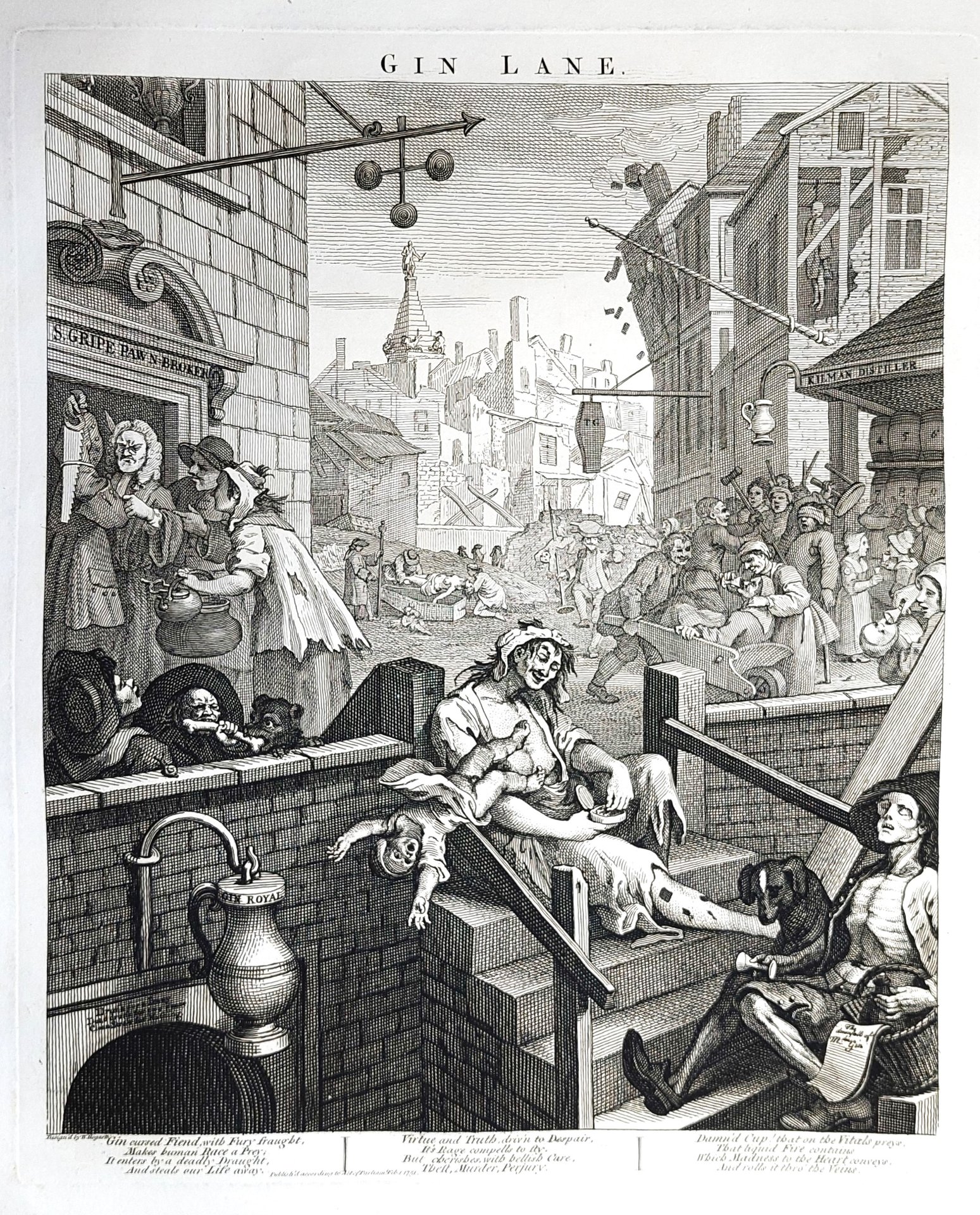 Stampa antica Antique print Original Autore William Hogarth Gin Lane Stampa originale di William Heath da matrici originali di William Hogart 1822