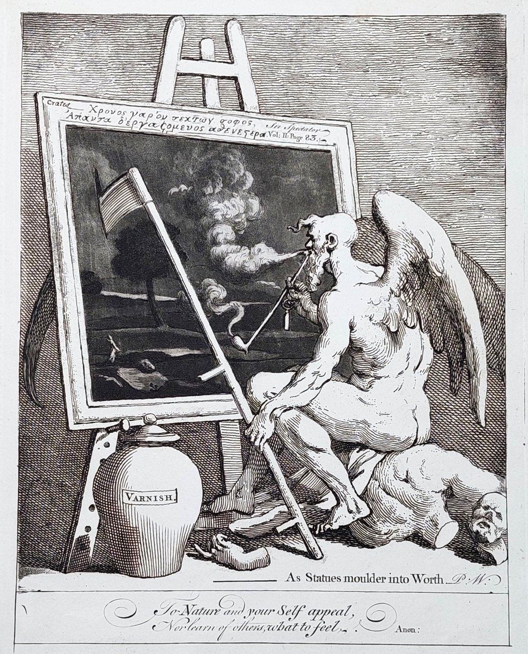 Time Smoking a Picture di William Hogarth parla degli intenditori d'arte e del loro fuorviante entusiasmo per i dipinti antichi di qualsiasi qualità o mancanza, e dell'idea popolare secondo cui il "tempo" migliora e addolcisce l'arte. Il ritratto del tempo e delle sue attività fatto da William Hogarth è tutt'altro che lusinghiero. Si siede su una statua che ha completamente distrutto. Una mano mozzata indica direttamente la vernice sempre più scura del tempo. Il "Tempo" intanto osserva un dipinto che annerisce e oscura con il fumo copioso della sua pipa, con la mano sinistra regge la falce che ha anche negligentemente squarciato la tela.