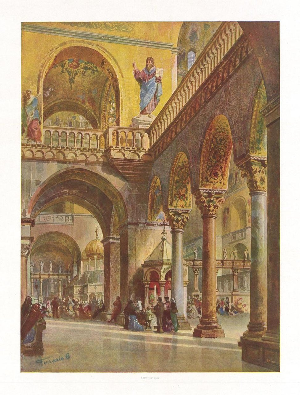 Stampa, antica ed originale, della veduta interna della chiesa di San Marco in Venezia raffigurante l'ultima parte della navata minore