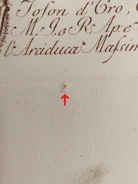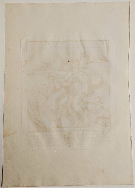 Incisione su carta vergata coeva, carta robusta e croccante, un foro al margine bianco inferiore, fuori dalla battuta. Alcune leggere macchie e tracce di polvere ai margini come da immagine.