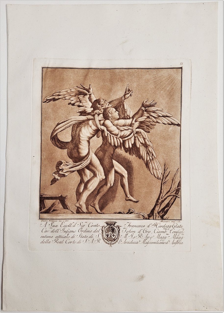 Stampa antica Incisione due angeli Giulio Romano pittore Mulinari incisione 1784
