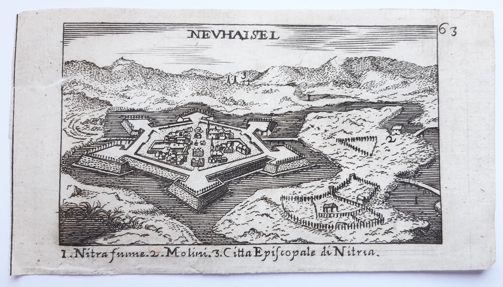 Stampa antica Old print Acquaforte Nevhaisel Ungheria by C. Laurentio P. Malatesta 1685