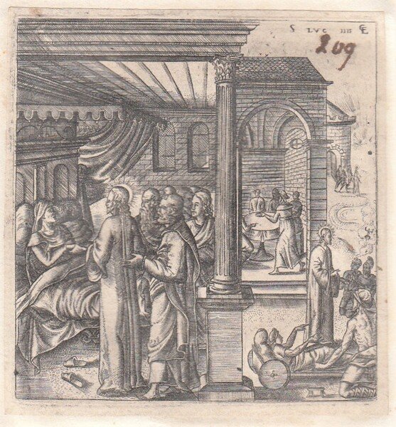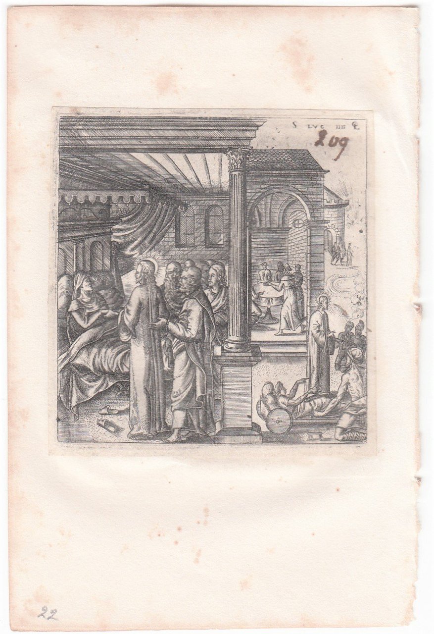 Stampa antica Old print Bulino L. Gaultier Gesù guarisce la suocera di Pietro 1576-80