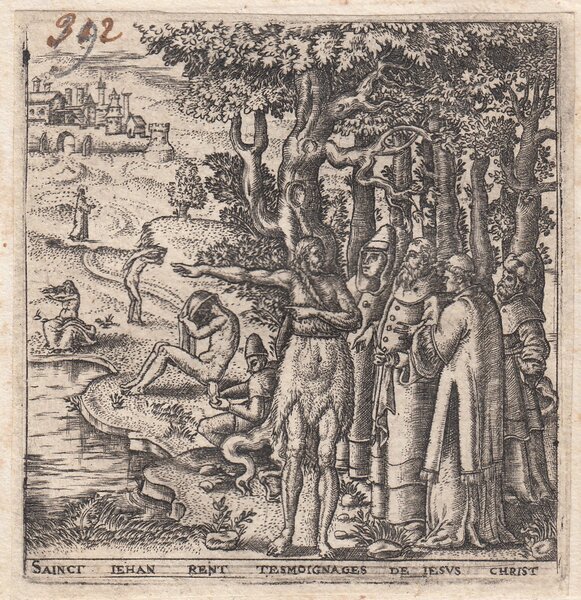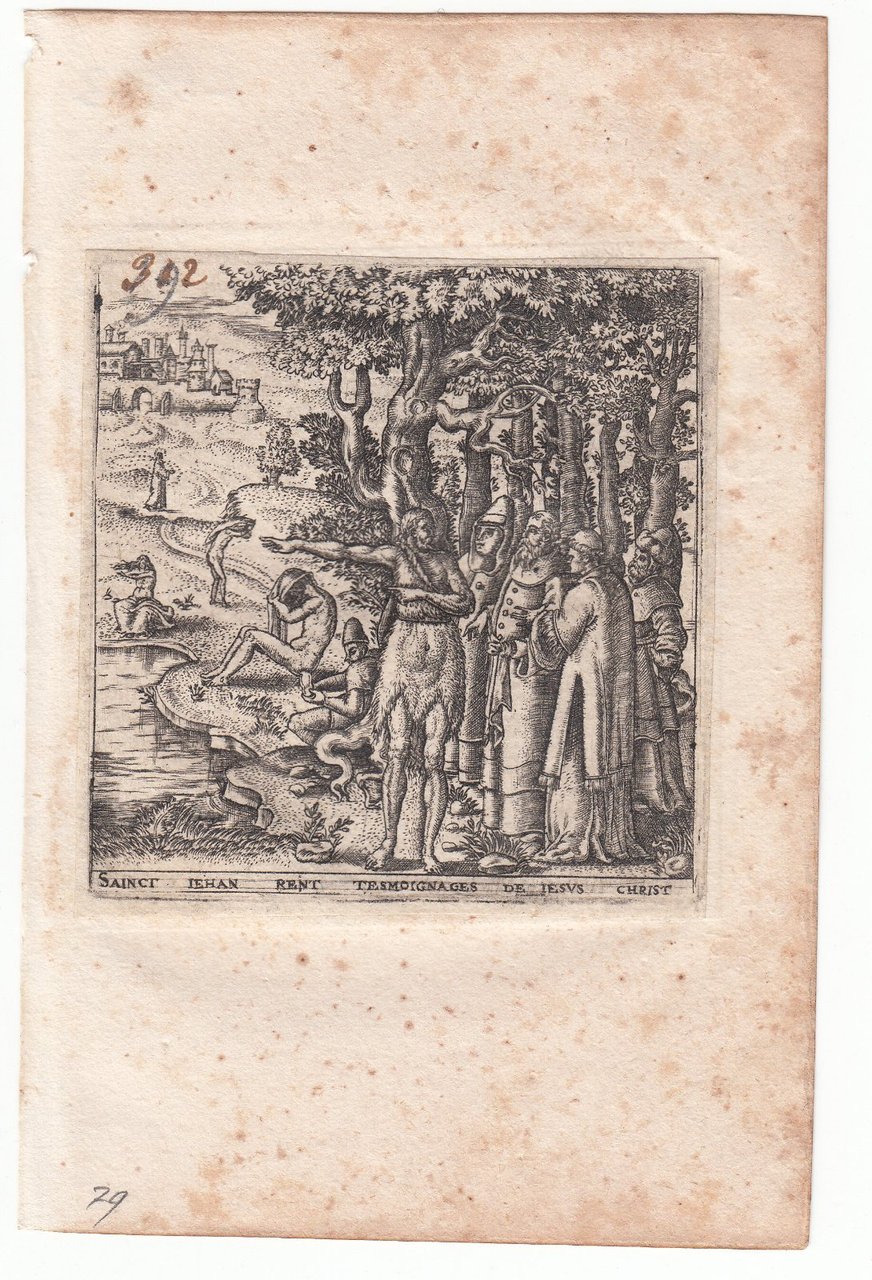 Stampa antica Old print Bulino L. Gaultier Giovanni Battista testimonia per Gesù 1576-80