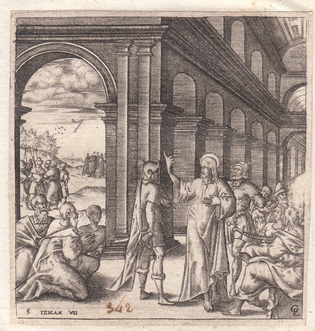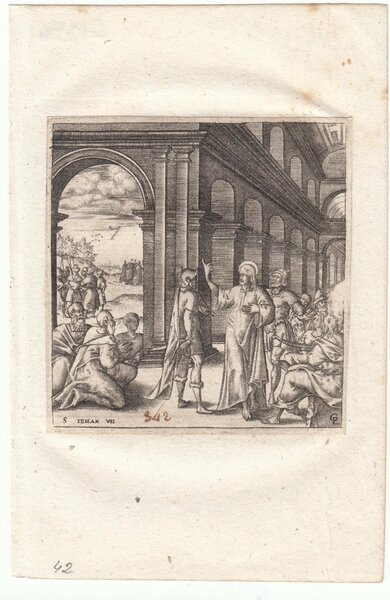 Stampa antica Old print Bulino L. Gaultier Giovanni VII Gesù annuncia la sua partenza 1576-80