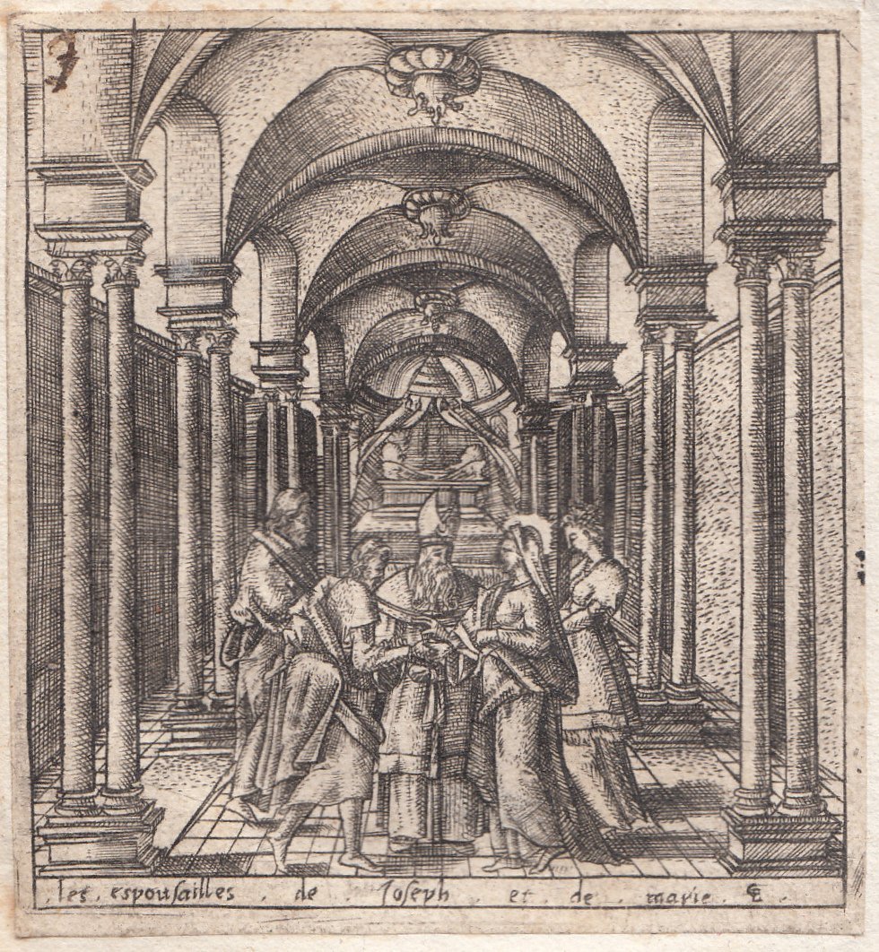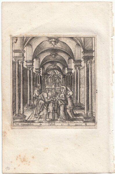 Stampa antica Old print Bulino L. Gaultier lo sposalizio di Giuseppe e Maria 1576-80