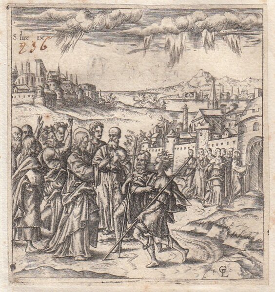 Stampa antica Old print Bulino L. Gaultier Luca IX Gesù guarisce un epilettico 1576-80