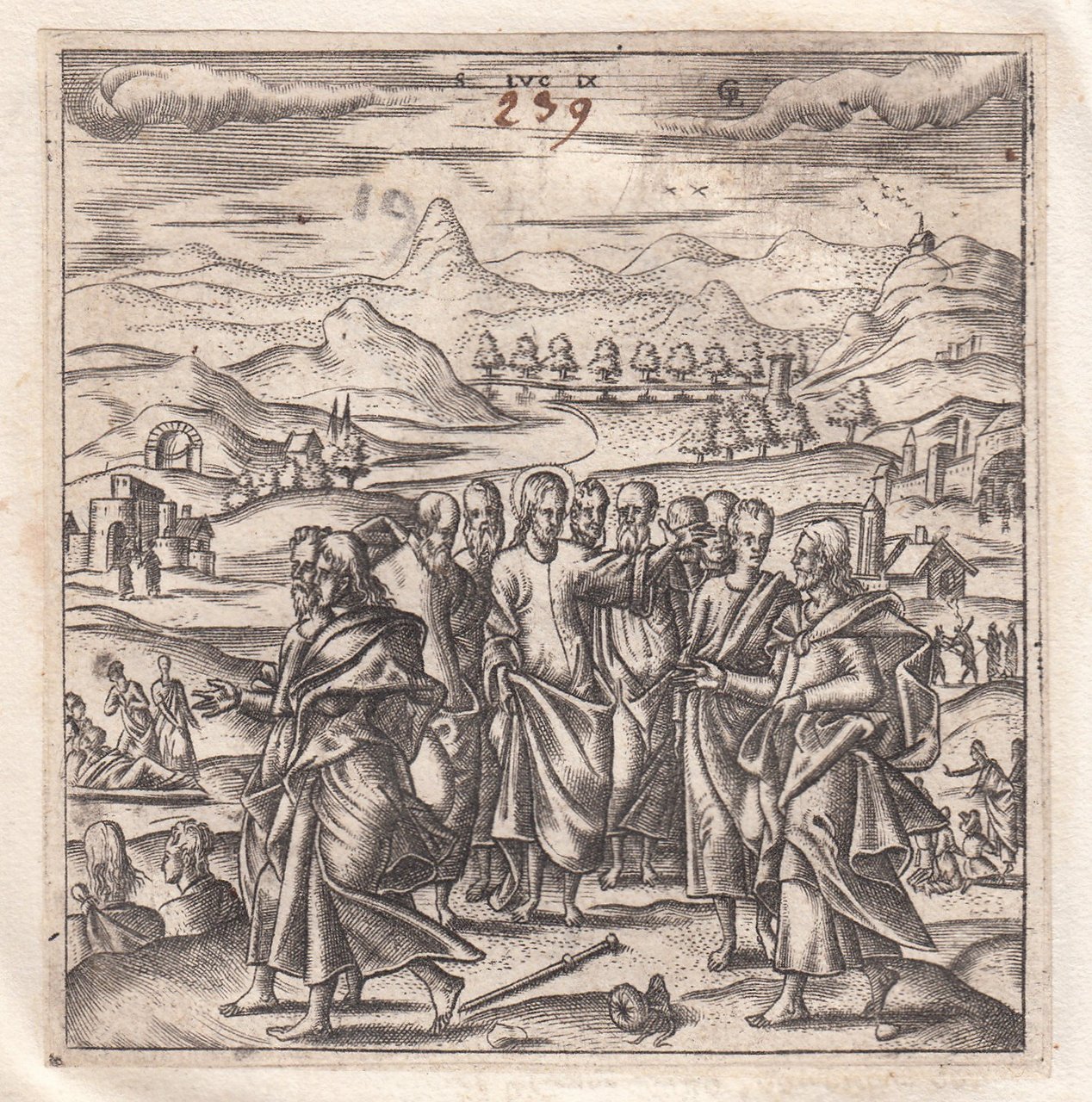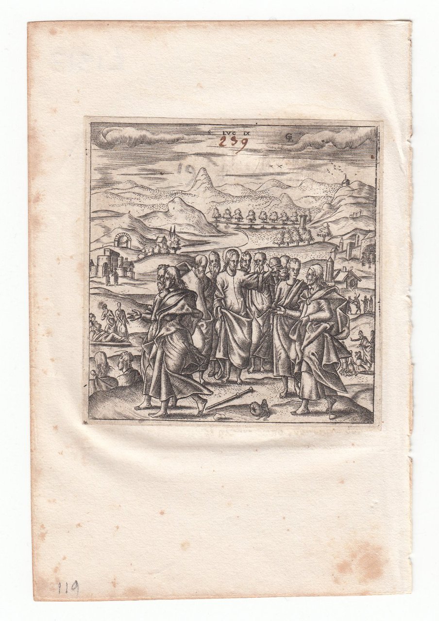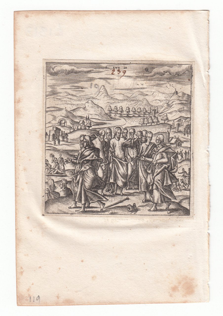 Stampa antica Old print Bulino L. Gaultier Luca IX La missione dei dodici apostoli 1576-80