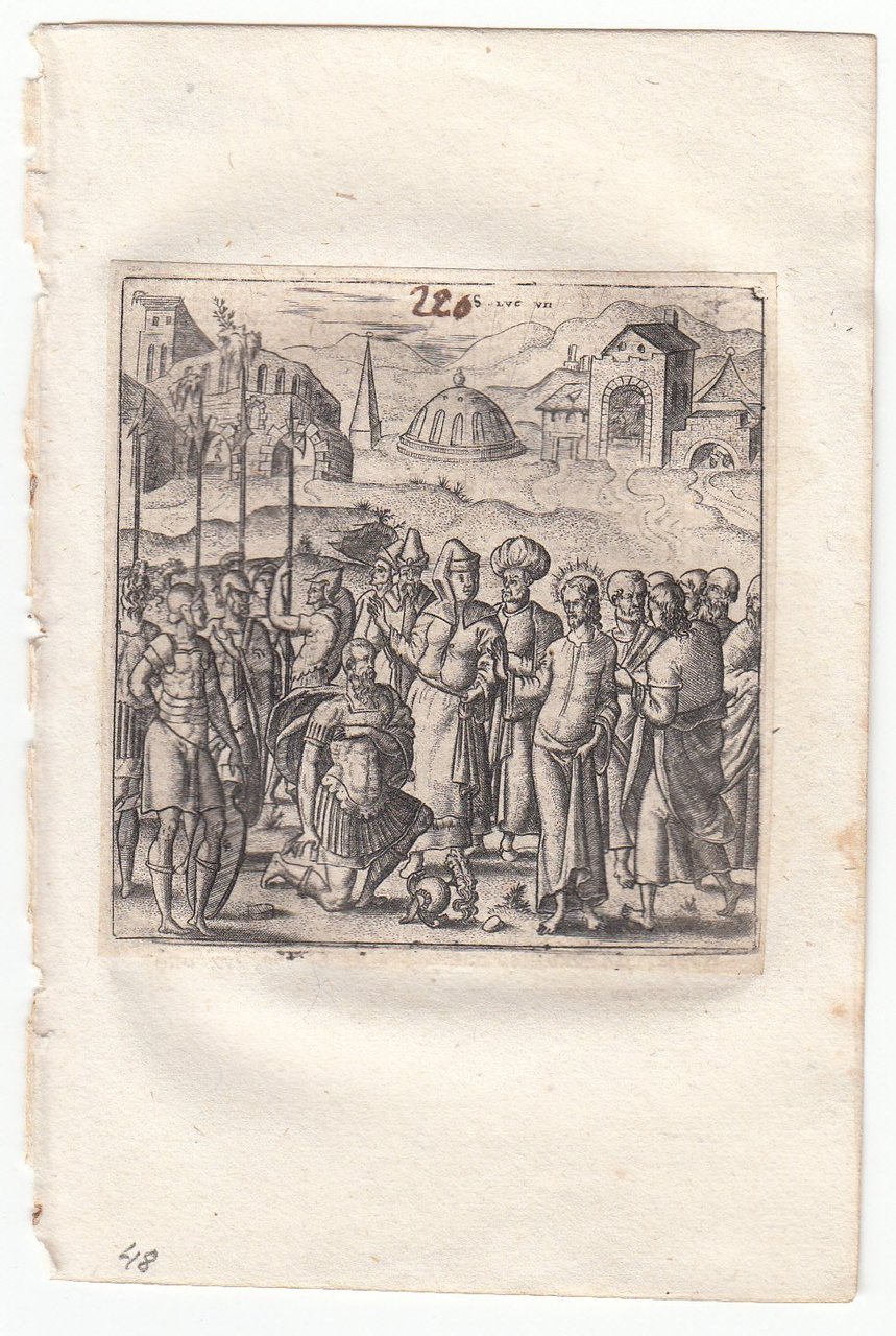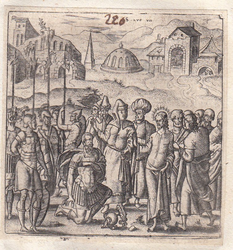 Stampa antica Old print Bulino L. Gaultier Luca VII Gesù e il centurione 1576-80