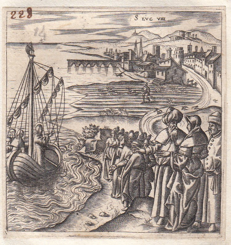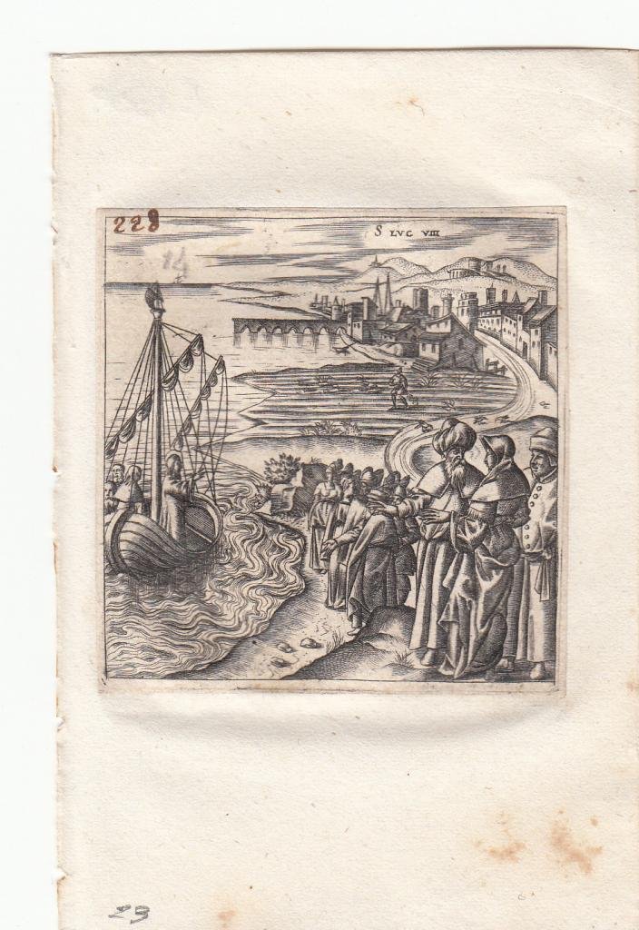 Stampa antica Old print Bulino L. Gaultier Luca VIII Gesù placa il lago in tempesta 1576-80