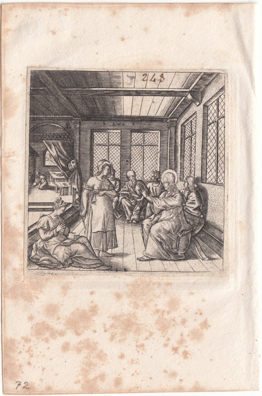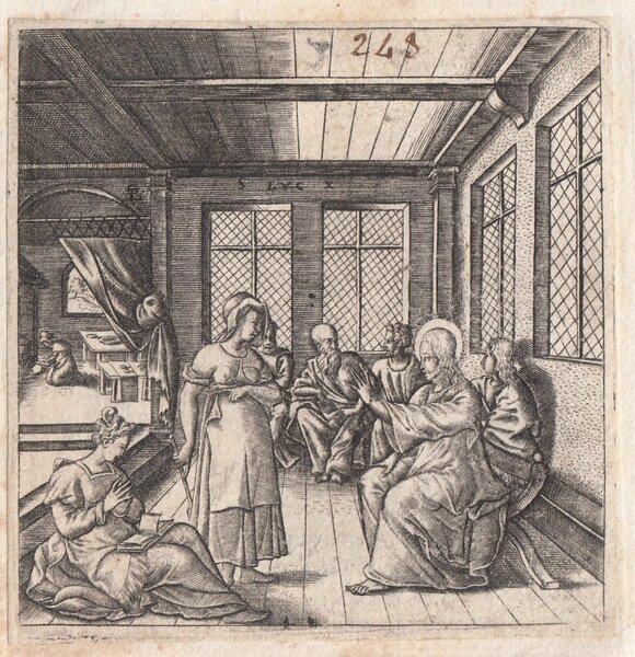 Stampa antica Old print Bulino L. Gaultier Luca X Gesù nella casa di Martia e di Marta 1576-80