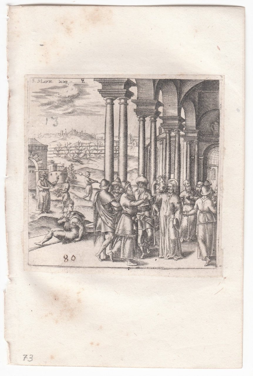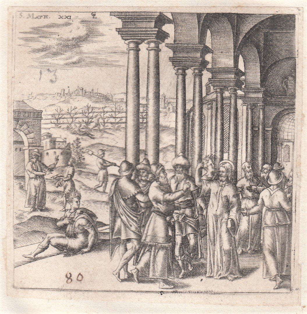 Stampa antica Old print Bulino L. Gaultier Matteo XXI Gesù scaccia i venditori dal tempio 1576-80