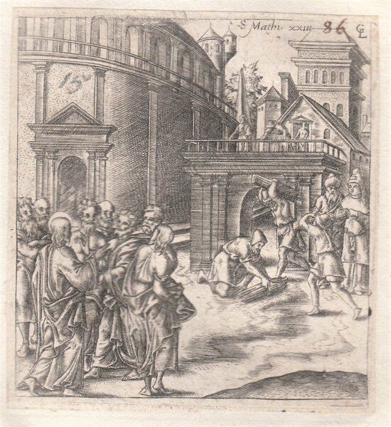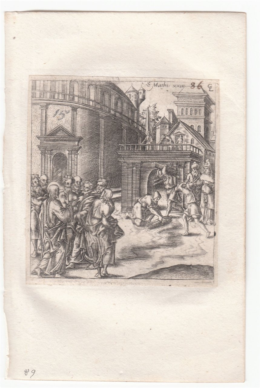 Stampa antica Old print Bulino L. Gaultier Matteo XXIII Gesù contro scribi e farisei 1576-80