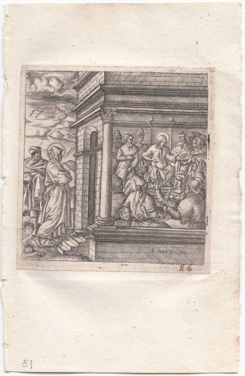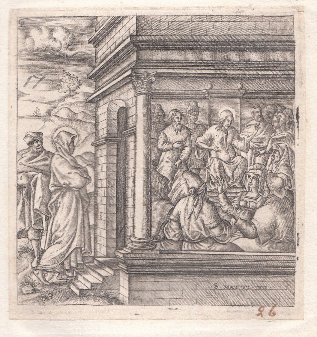 Stampa antica Old print Bulino L. Gaultier San Matteo IX Gesù guarisce una donna 1576-80