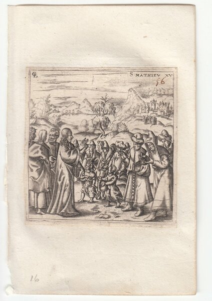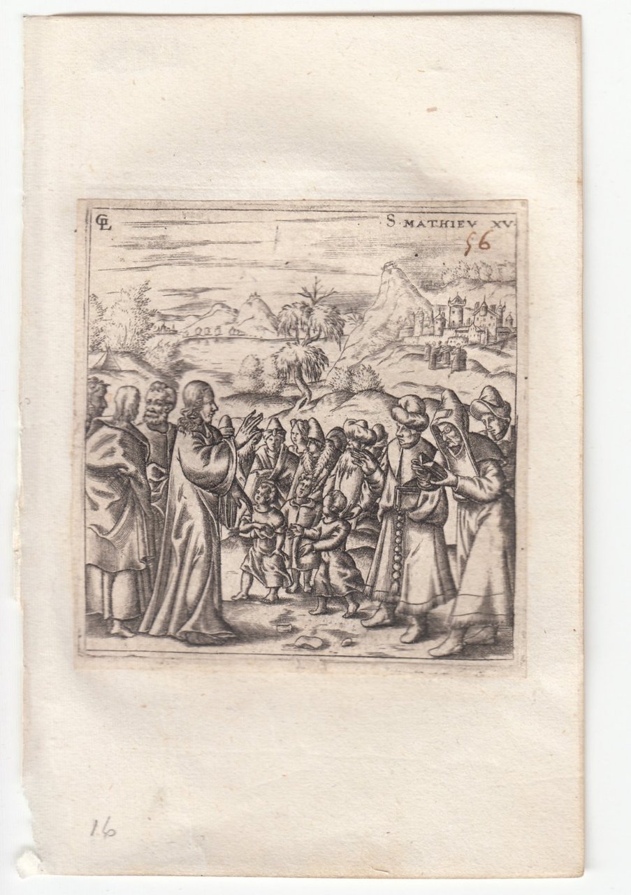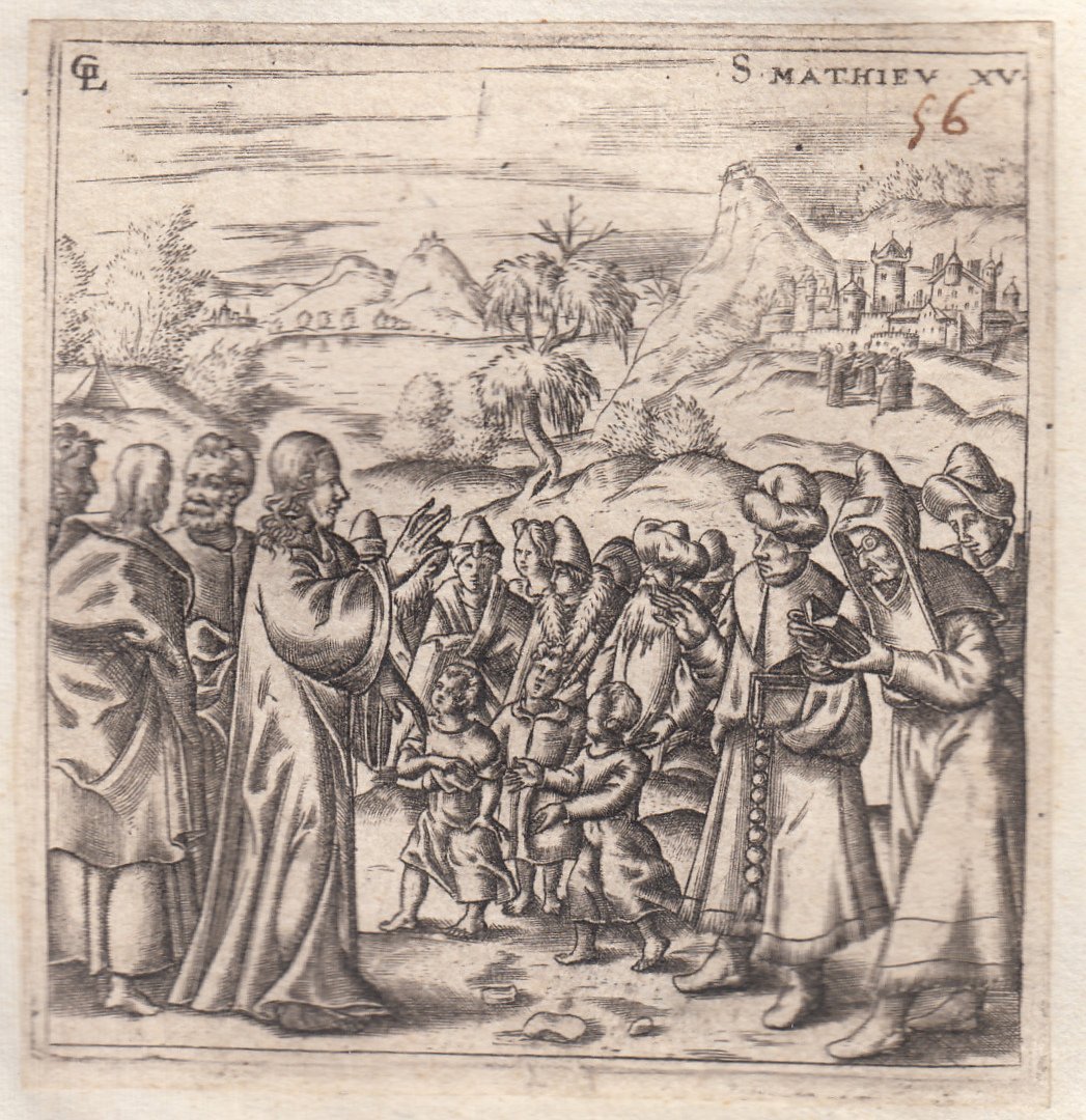 Stampa antica Old print Bulino L. Gaultier San Matteo XV Gesù e le polemiche dei farisei 1576-80