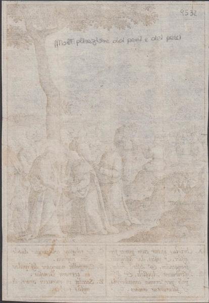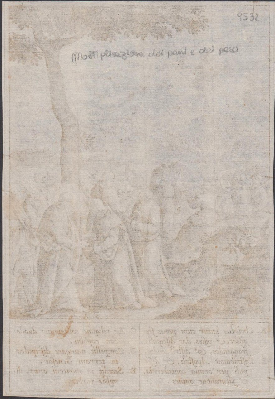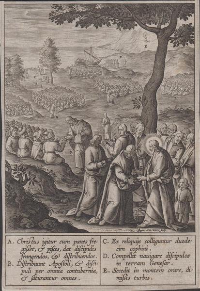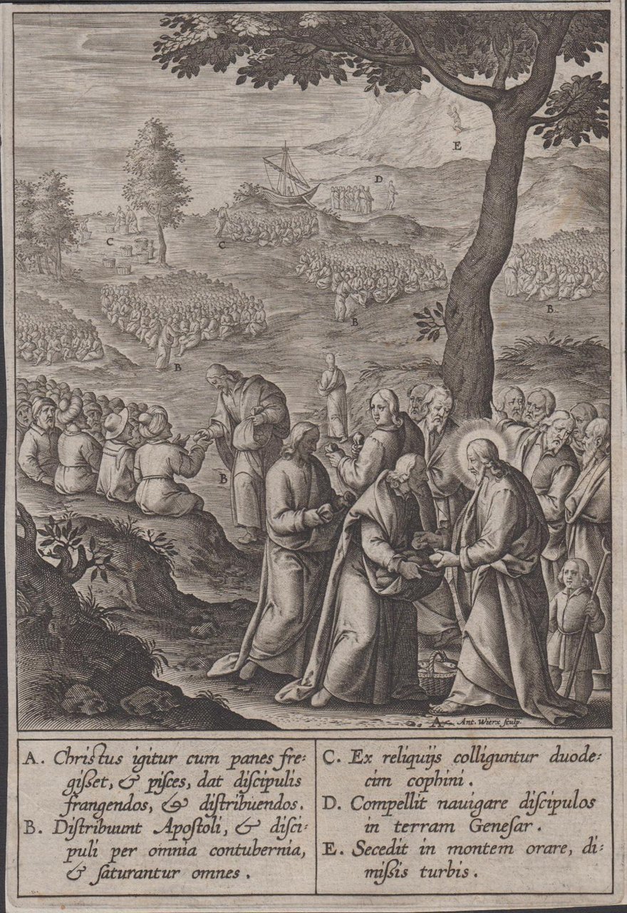 Stampa antica old print Gesù e Moltiplicazione dei pani e dei pesci H. Wierix 1596