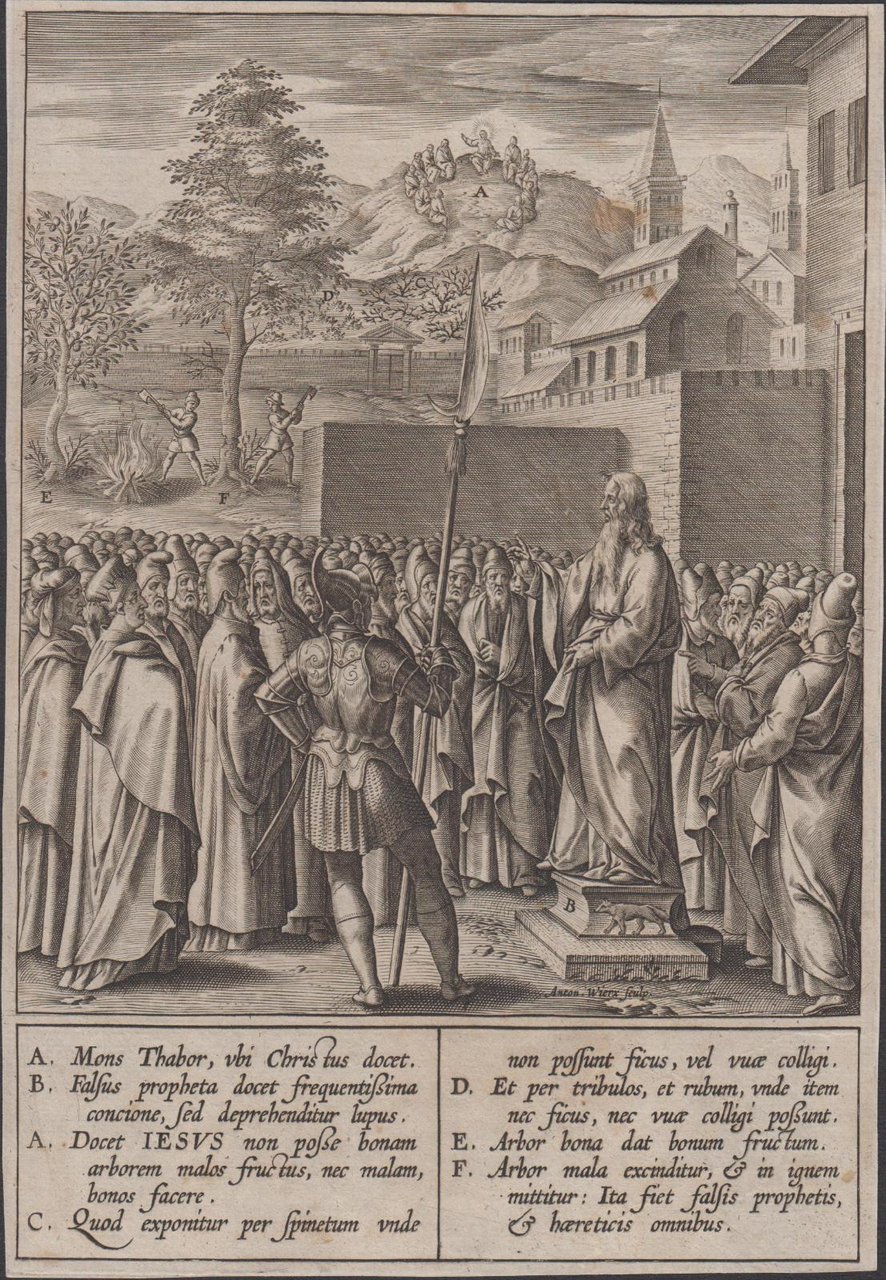 Stampa antica old print Guardatevi dai falsi profeti Hieronymus Wierix 1596