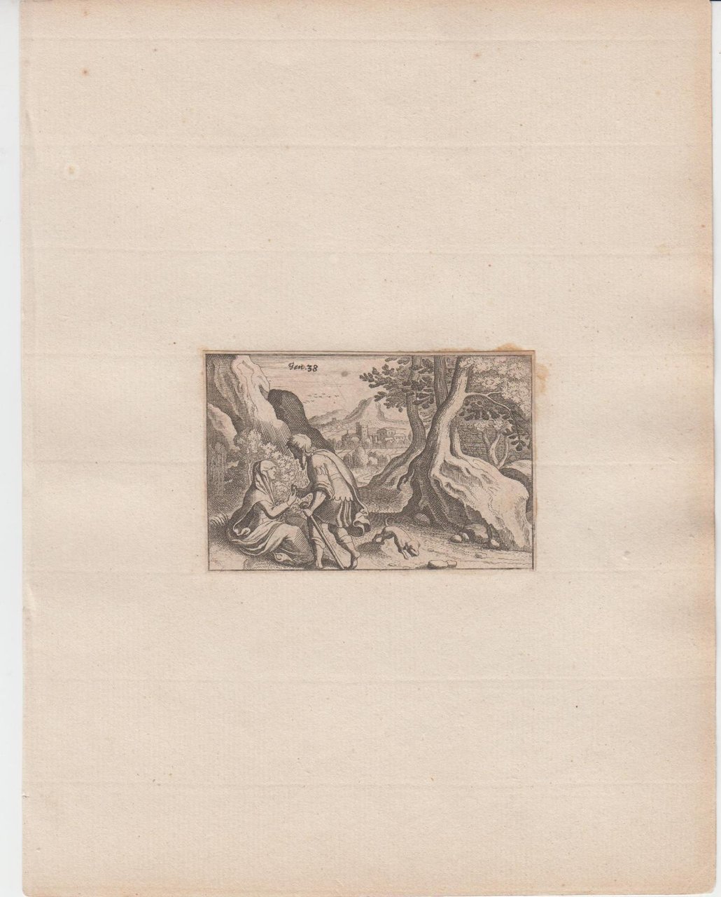 Stampa antica old print Incisione Étienne Delaune (1518-1583) Giuda e Tamar
