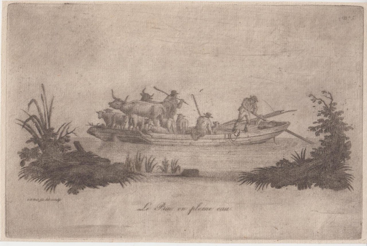 Stampa antica old print Incisione Jean Baptiste Huet Le Bac En Pleine Eau 1770-1800 c.a.