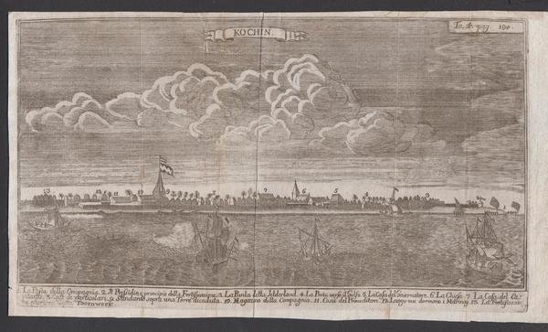 Stampa antica old print Incisione Veduta di Kochi Cochin Malabar India 1770 c.a.