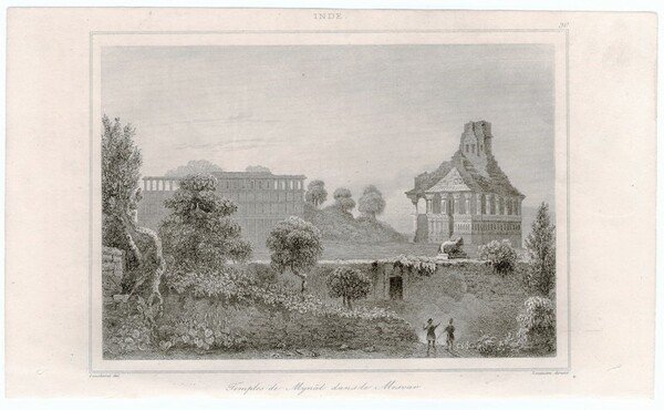 Stampa antica Old print India tempio Mynal ad Mewa Lemaitre 1841
