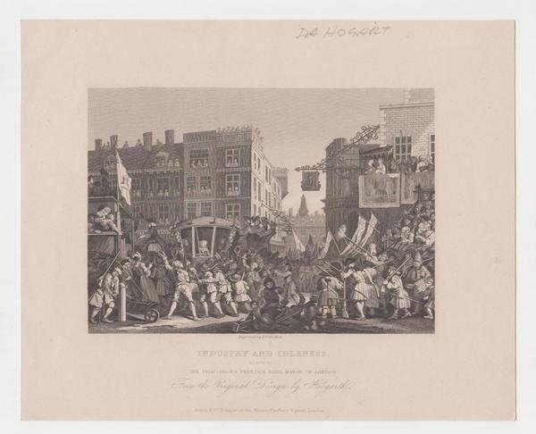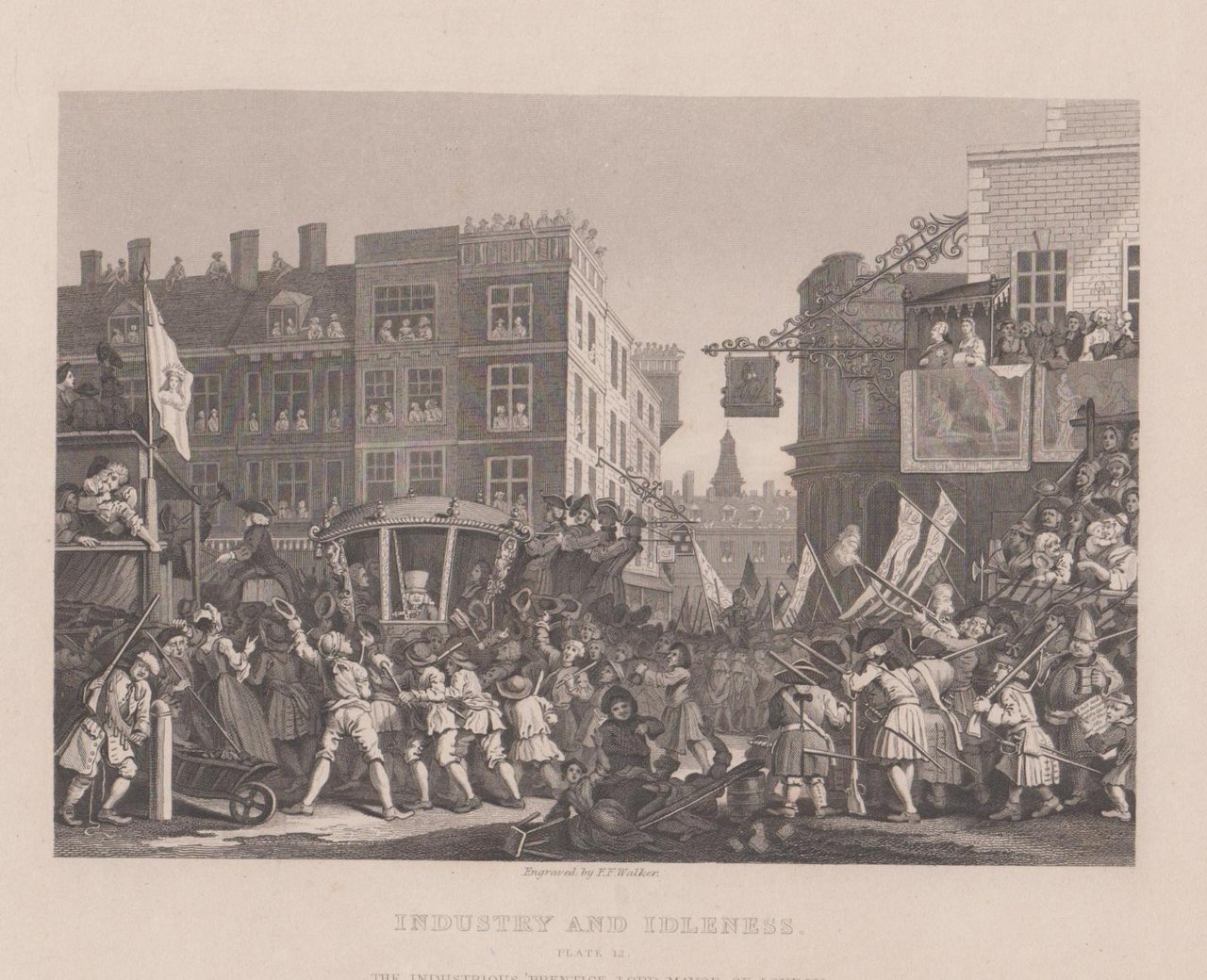Stampa antica old print Industry and idleness William Hogarth tav 12 1850 c.a.